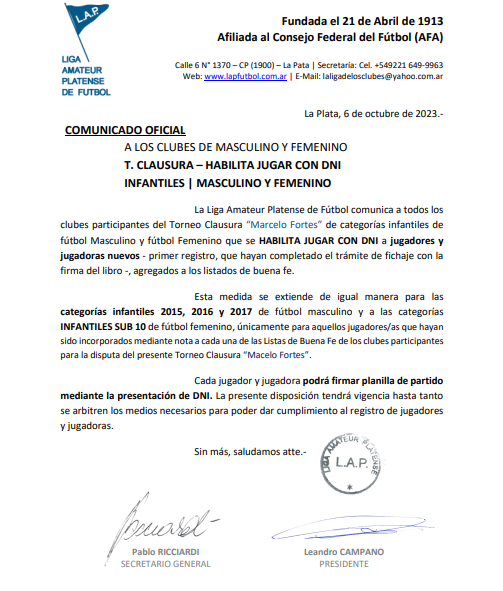 Femenino COMUNICADO OFICIAL: HABILITA JUGAR CON DNI SÁBADO 30/09 Y DOMINGO 1/10 Leer Mas 29 septiembre, 2023