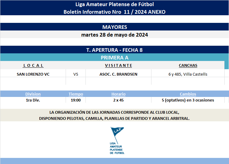 Les compartimos el boletín informativo con la programación ANEXO Nro°11 a disputarse el próximo martes 28/05 según el siguiente cronograma: