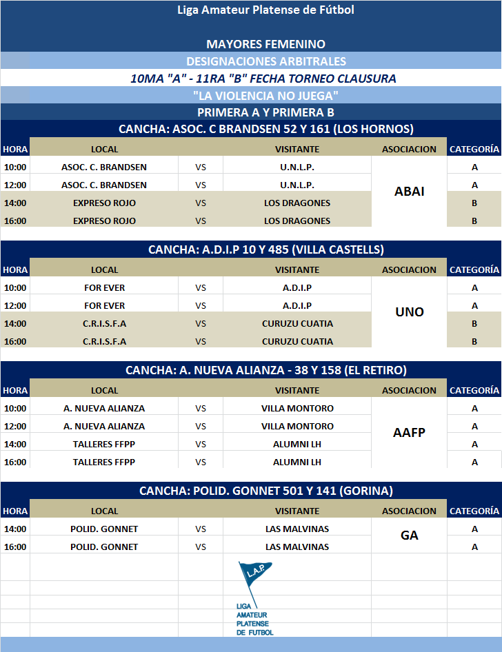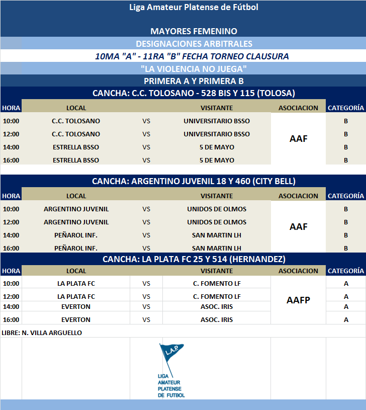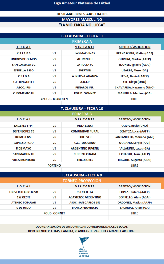 Compartimos las designaciones arbitrales para los partidos de la FECHA 11 de la PRIMERA A, FECHA 10 de la PRIMERA B Y FECHA 9 del Torneo Proyección Clausura Masculino y de la FECHA 11 de la PRIMERA B y FECHA 10 de la PRIMERA A Torneo Clausura Femenino 2024.