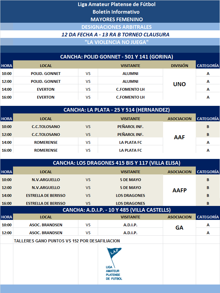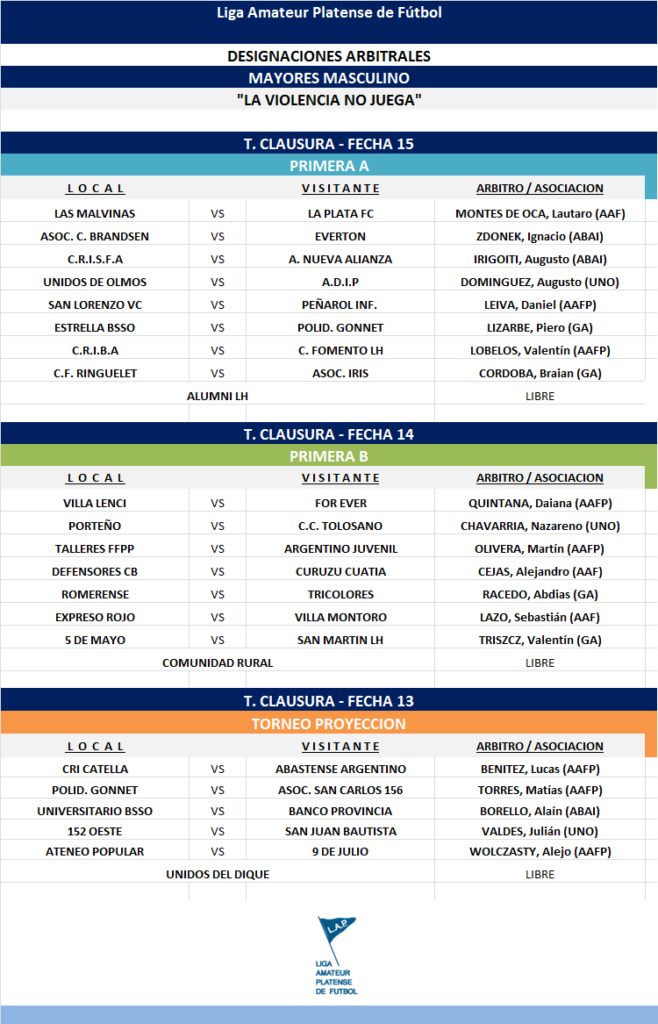 Compartimos las designaciones arbitrales para los partidos de la FECHA 15 de la PRIMERA A, FECHA 14 de la PRIMERA B Y FECHA 13 del Torneo Proyección Clausura Masculino y de la FECHA 13 de la PRIMERA B y FECHA 12 de la PRIMERA A Torneo Clausura Femenino 2024.