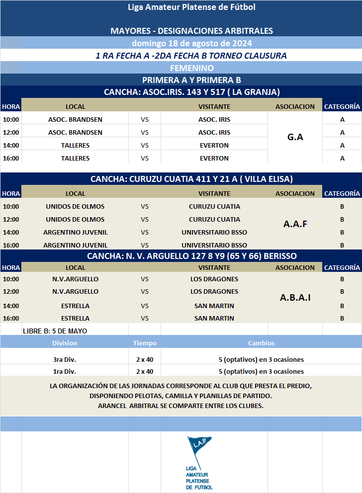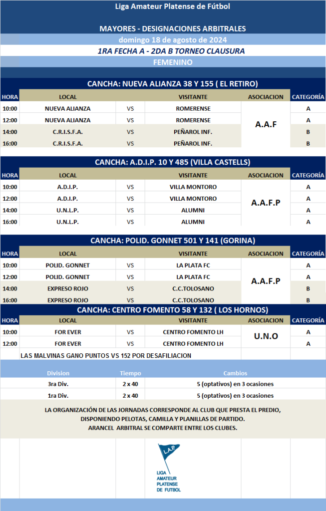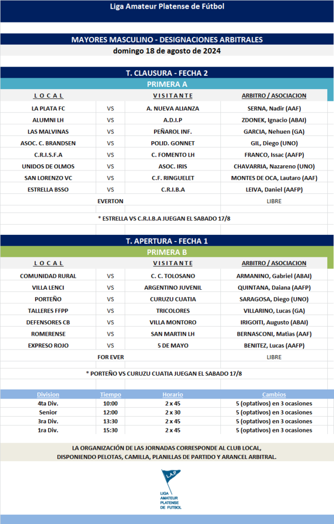 Compartimos las designaciones arbitrales para los partidos de la FECHA 2 de la PRIMERA A y FECHA 1 de la PRIMERA B Torneo Clausura Masculino y de la FECHA 2 de la PRIMERA B y FECHA 1 de la PRIMERA A Torneo Clausura Femenino 2024.