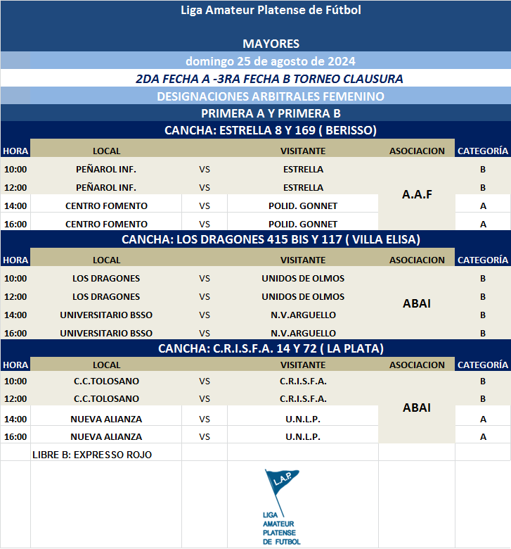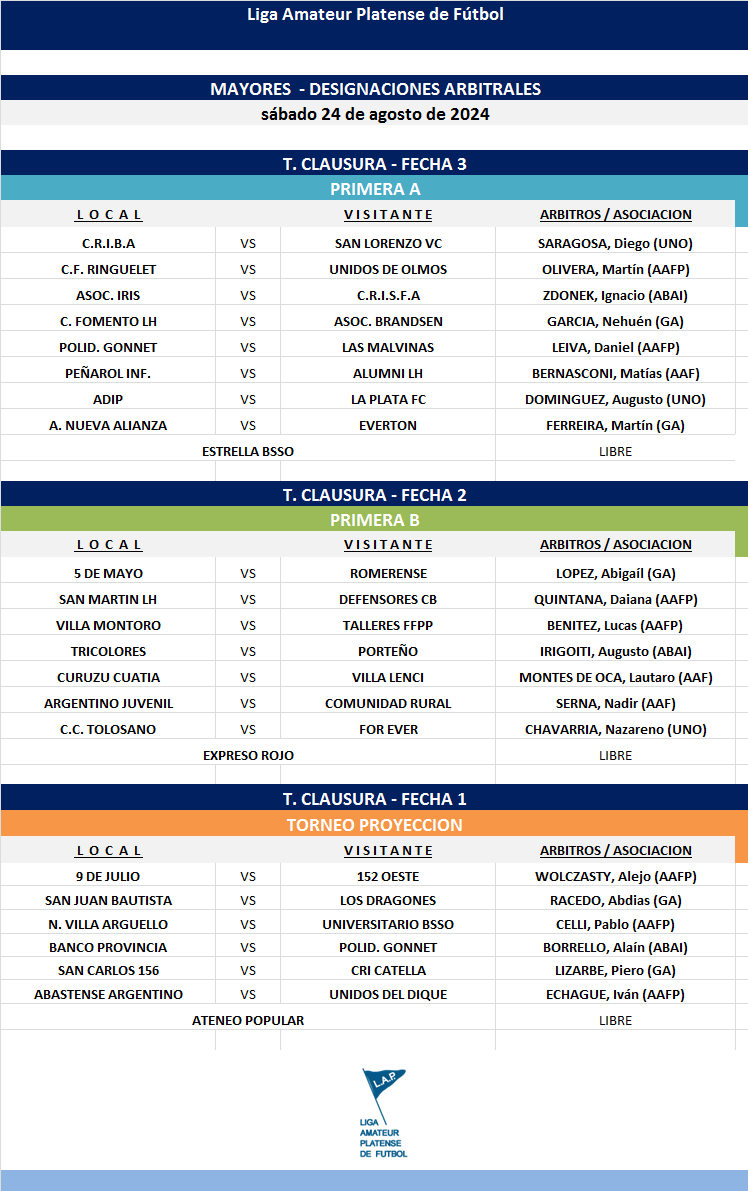 Compartimos las designaciones arbitrales para los partidos de la FECHA 3 de la PRIMERA A, FECHA 2 de la PRIMERA B Y FECHA 1 del Torneo Proyección Clausura Masculino y de la FECHA 3 de la PRIMERA B y FECHA 2 de la PRIMERA A Torneo Clausura Femenino 2024.