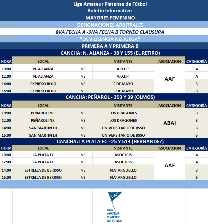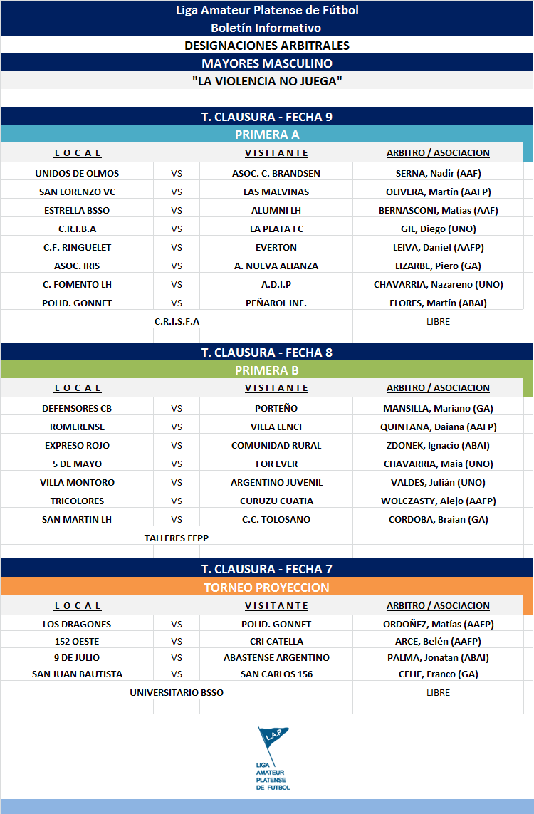 Compartimos las designaciones arbitrales para los partidos de la FECHA 9 de la PRIMERA A, FECHA 8 de la PRIMERA B Y FECHA 7 del Torneo Proyección Clausura Masculino y de la FECHA 9 de la PRIMERA B y FECHA 8 de la PRIMERA A Torneo Clausura Femenino 2024.