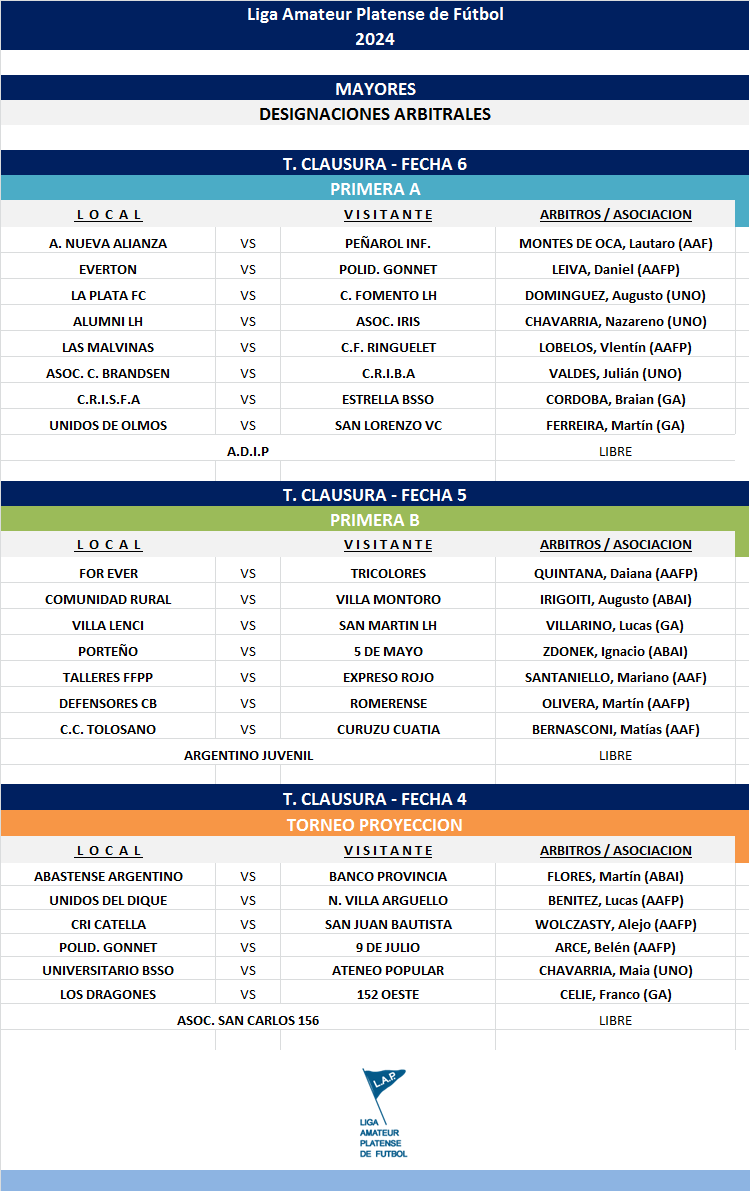 Compartimos las designaciones arbitrales para los partidos de la FECHA 6 de la PRIMERA A, FECHA 5 de la PRIMERA B Y FECHA 4 del Torneo Proyección Clausura Masculino.