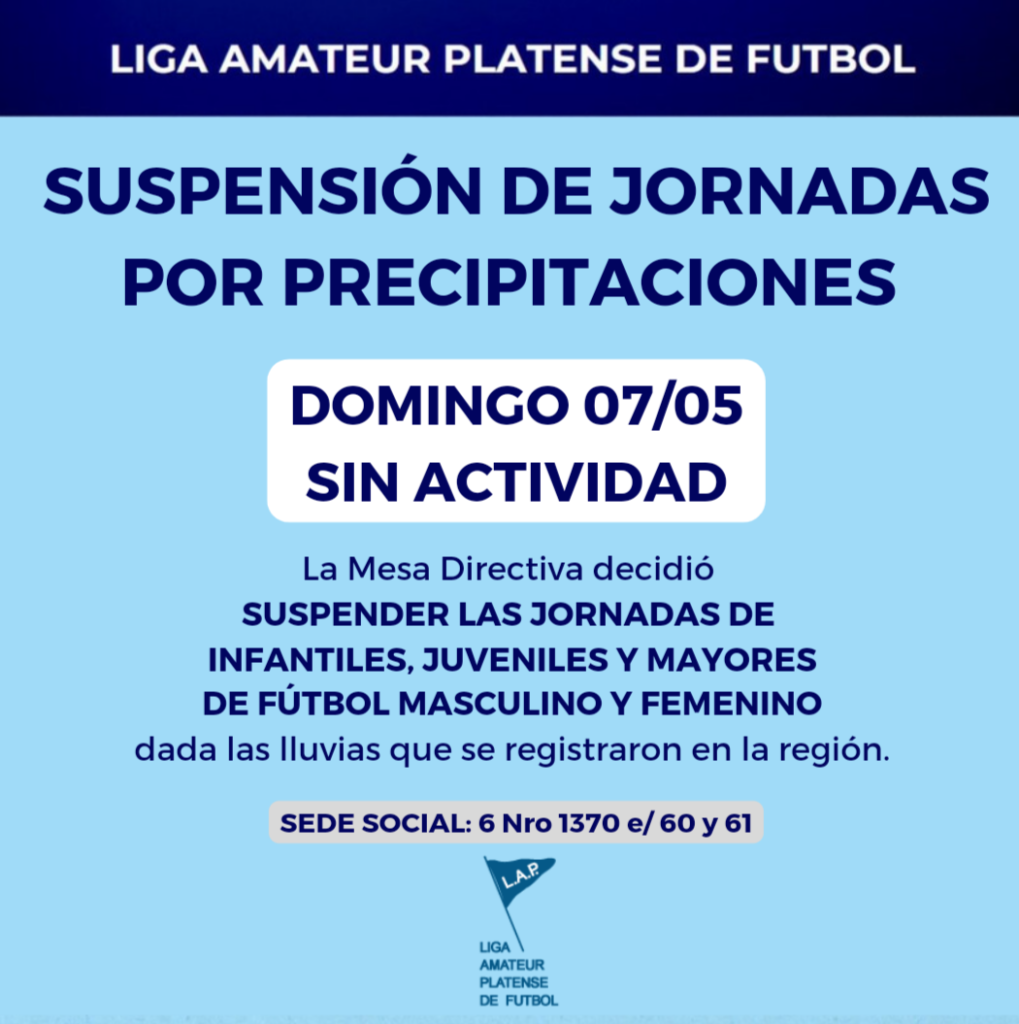 Dadas las condiciones climáticas que se registraron en la región, la Mesa Directiva decidió suspender la totalidad de los partidos programados para hoy domingo 07/05 por el T. Apertura «Prof. Luis Martín | Campeón del Mundo» correspondiente a la FECHA 7 de Primera A, la FECHA 5 de Primera B y la FECHA 4 del T. Ascenso de fútbol #Masculino en Infantiles, Juveniles y Mayores; y la FECHA 6 de fútbol #Femenino en Mayores.