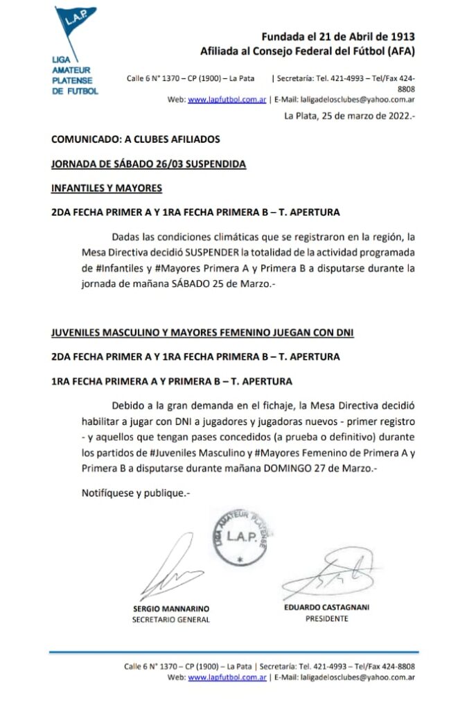 Dadas las precipitaciones que se registraron en la región, la Mesa Directiva decidió suspender los partidos de #Infantiles y #Mayores de Primera A y Primera B programados para mañana sábado 26/03 por el T. Apertura “Domingo Carballo”.