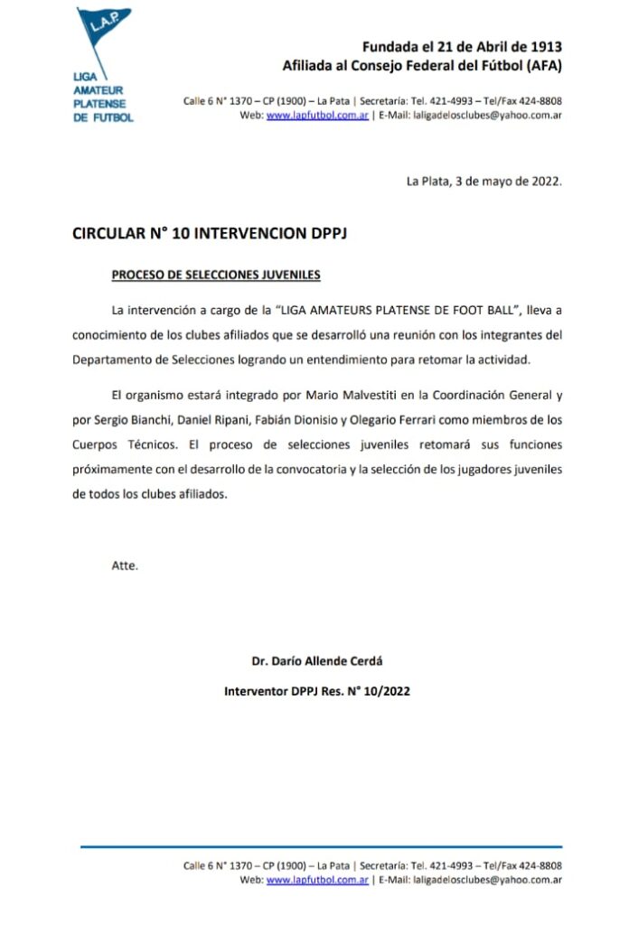 Compartimos la Circular Nro 10 del Interventor de la Dirección Provincial de Personas Jurídicas Dr. Darío Allende Cerdá a los clubes afiliados.