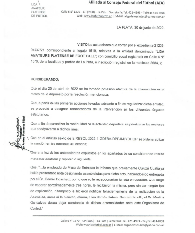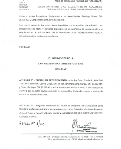 En el marco de las actividades que viene desarrollando esta Intervención, se notifica a la totalidad de los clubes afiliados la presente Resolución Nro 1 / 2022 en referencia a FORMULAR APERCIMIENTO a los Sres. Boschetti, Aldo y Boschetti, Camilo Guido del Centro de Fomento, Cultural, Social y Deportivo Curuzú Cuatiá; Mannarino, Sergio y Bravo. Santiago de la Agrupación de Fútbol Infantil Las Malvinas.