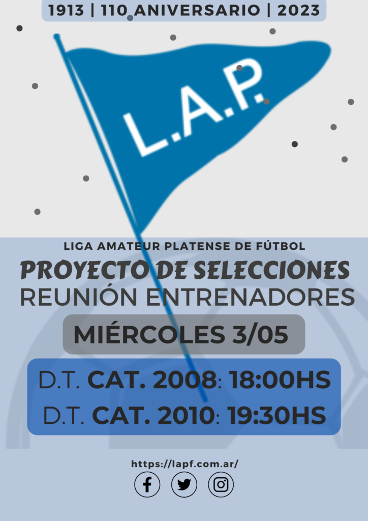 El Área Deportivo a cargo del Proyecto de Selecciones realiza la presente convocatoria a los directores técnicos de las categorías 2008 (7ma División) y 2010 (9na División) de todas las divisiones de fútbol masculino (Primera A, Primera B y Torneo Ascenso) a una reunión informativa con las autoridades de la Liga y los responsables de los seleccionados.
