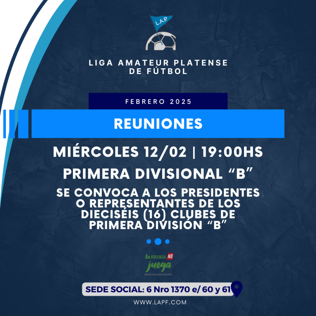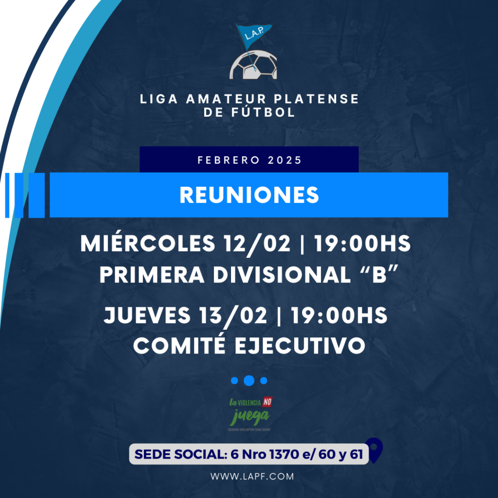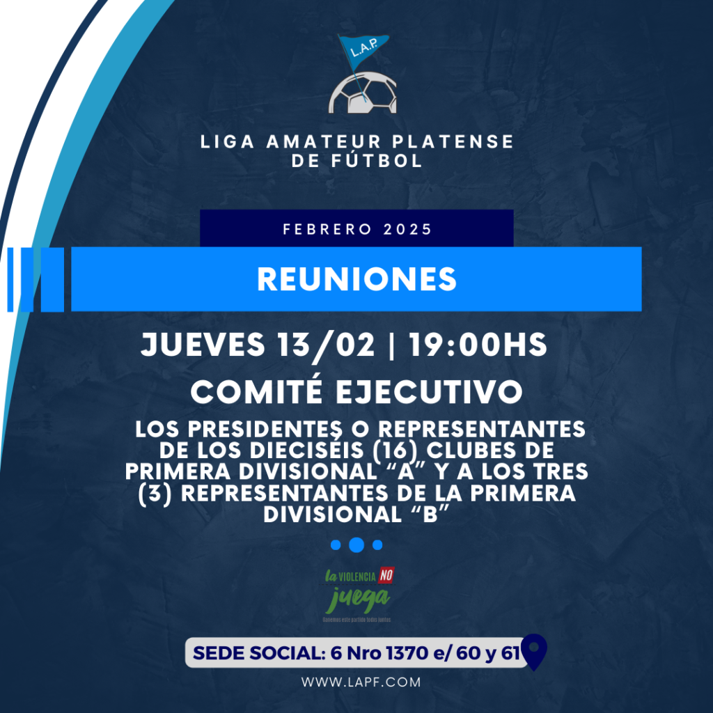 La Mesa Directiva de la Liga Amateur Platense de Fútbol notifica la presente convocatoria a Reunión de Comité Ejecutivo a realizarse el próximo JUEVES 13 DE FEBRERO desde las 19:00hs en la sede social.