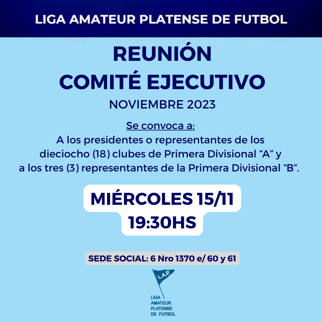 La Mesa Directiva de la Liga Amateur Platense de Fútbol notifica la presente convocatoria a Reunión de Comité Ejecutivo a realizarse el próximo MIÉRCOLES 15 DE NOVIEMBRE desde las 19:30hs en la sede social.
