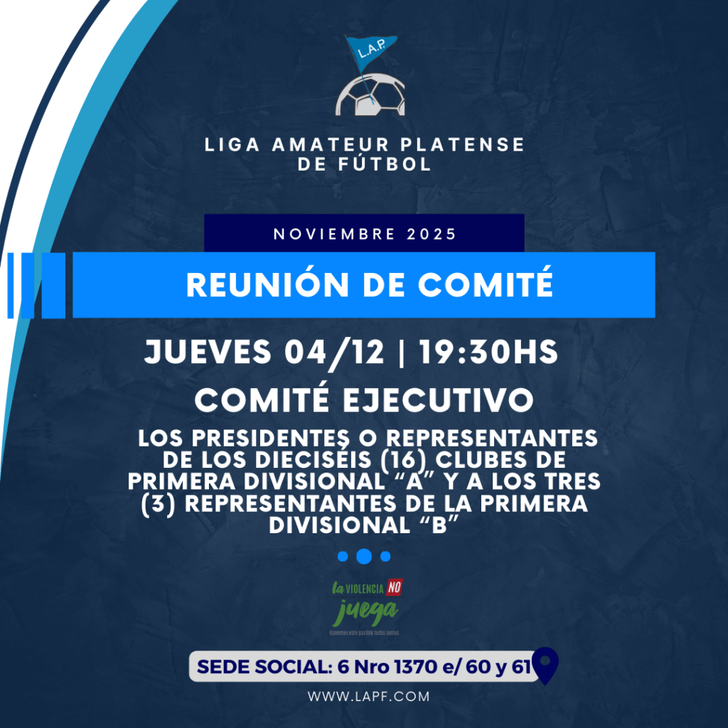 La Mesa Directiva de la Liga Amateur Platense de Fútbol notifica la presente convocatoria a Reunión de Comité Ejecutivo a realizarse el próximo JUEVES 4 DE DICIEMBRE desde las 19:30hs en la sede social.