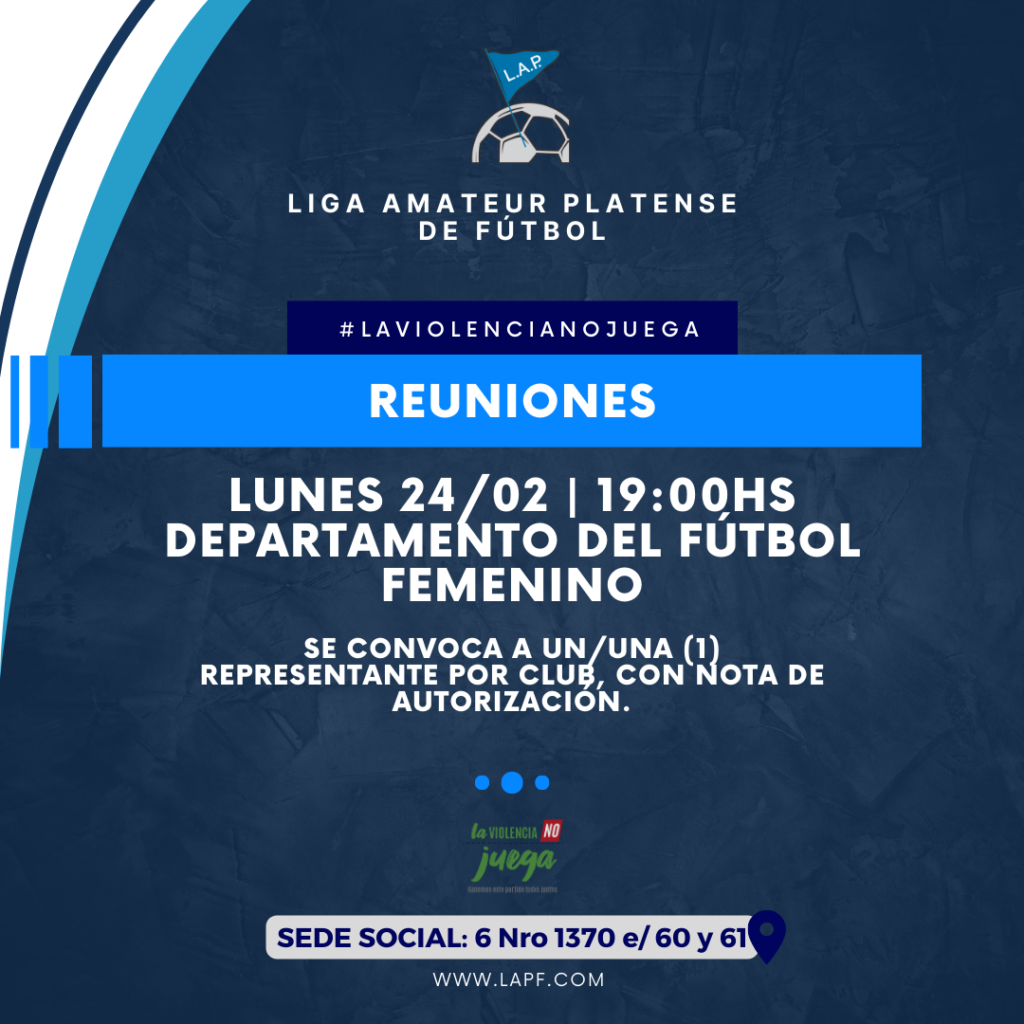 El Depto. del Fútbol Femenino de la Liga Amateur Platense de Fútbol notifica la presente convocatoria a Reunión del mismo a realizarse el próximo LUNES 24 DE FEBRERO desde las 19:00hs en la sede social.