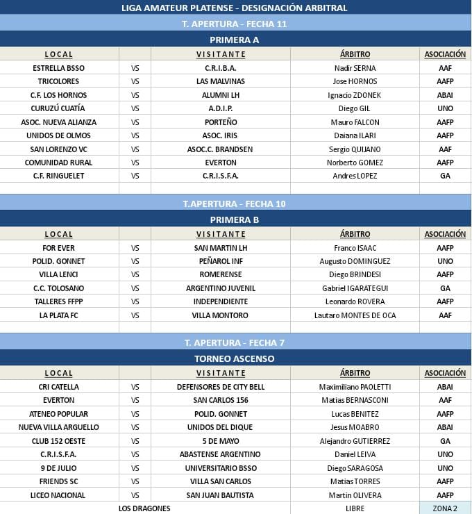 #Designaciones T. APERTURA 11MA FECHA PRIMERA A, 10MA FECHA PRIMERA B, 7MA FECHA ASCENSO MASCULINO