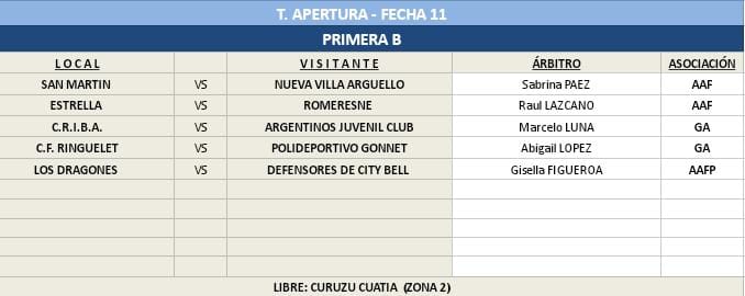 11RA FECHA – PRIMERA B Mayores
