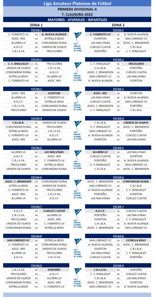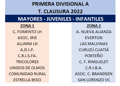 Compartimos el fixture del T. Clausura 2022 de Primera Divisional “A” ZONA 1 y ZONA 2 para categorías Mayores, Juveniles e Infantiles.
