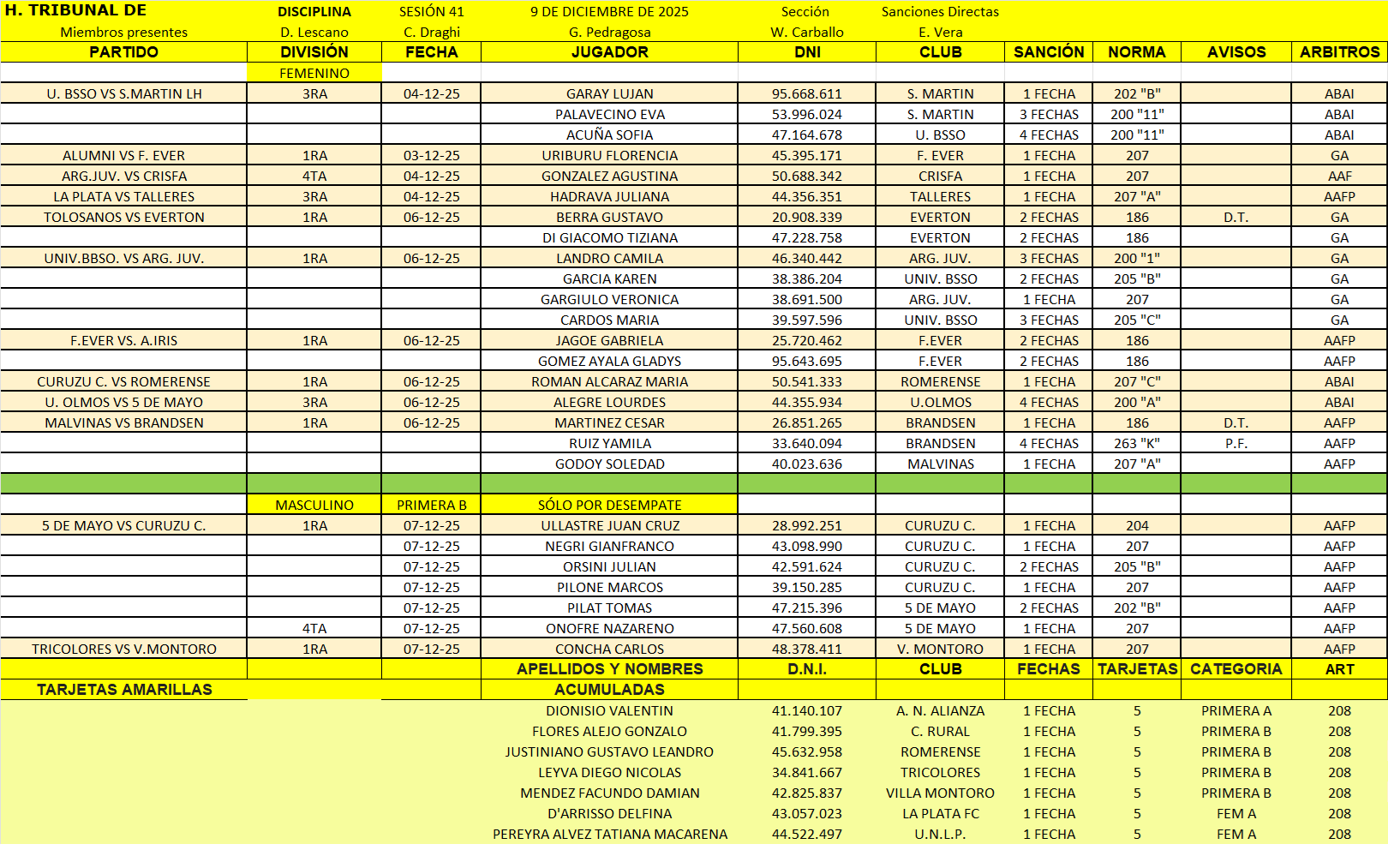 SESIÓN 41/2025 – FECHA: 09/12/2025 – MIEMBROS DEL TRIBUNAL PRESENTES: D. Lescano, C. Draghi, G. Pedragosa, E. Vera,  W. Carballo.