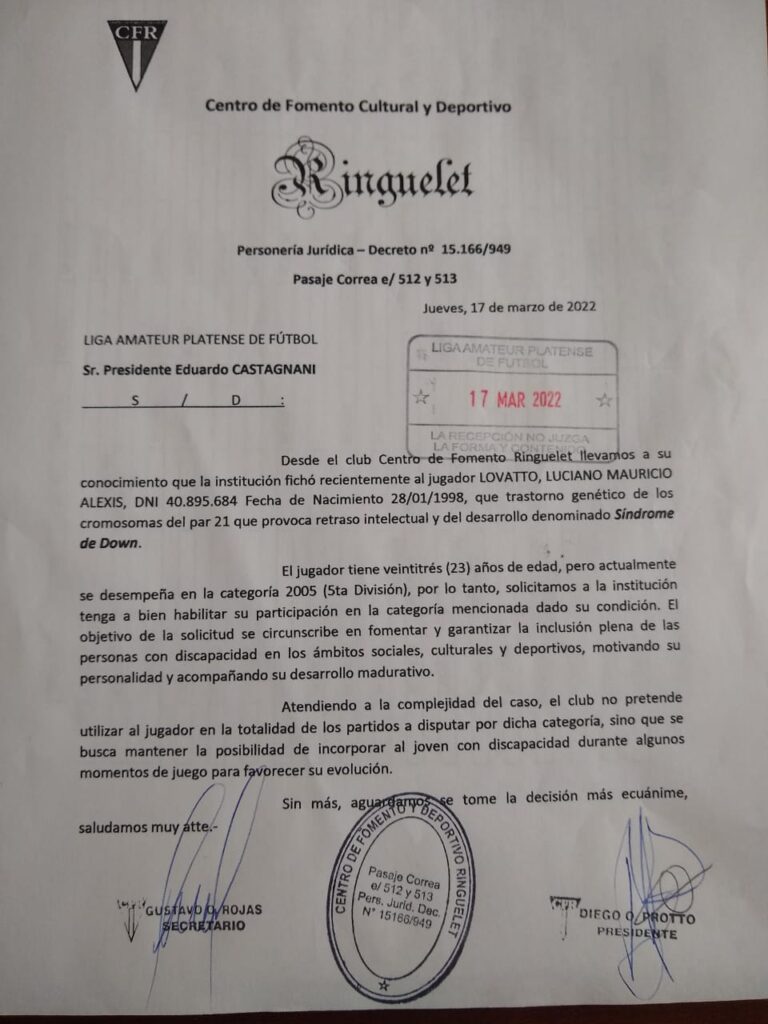 En su última reunión, el Comité Ejecutivo habilitó la participación de Luciano Lovatto cómo jugador de C. F. Ringuelet. Hoy Luciano se fichó como nuevo jugador del club y podrá jugar junto a sus compañeros en la próxima jornada de la categoría.