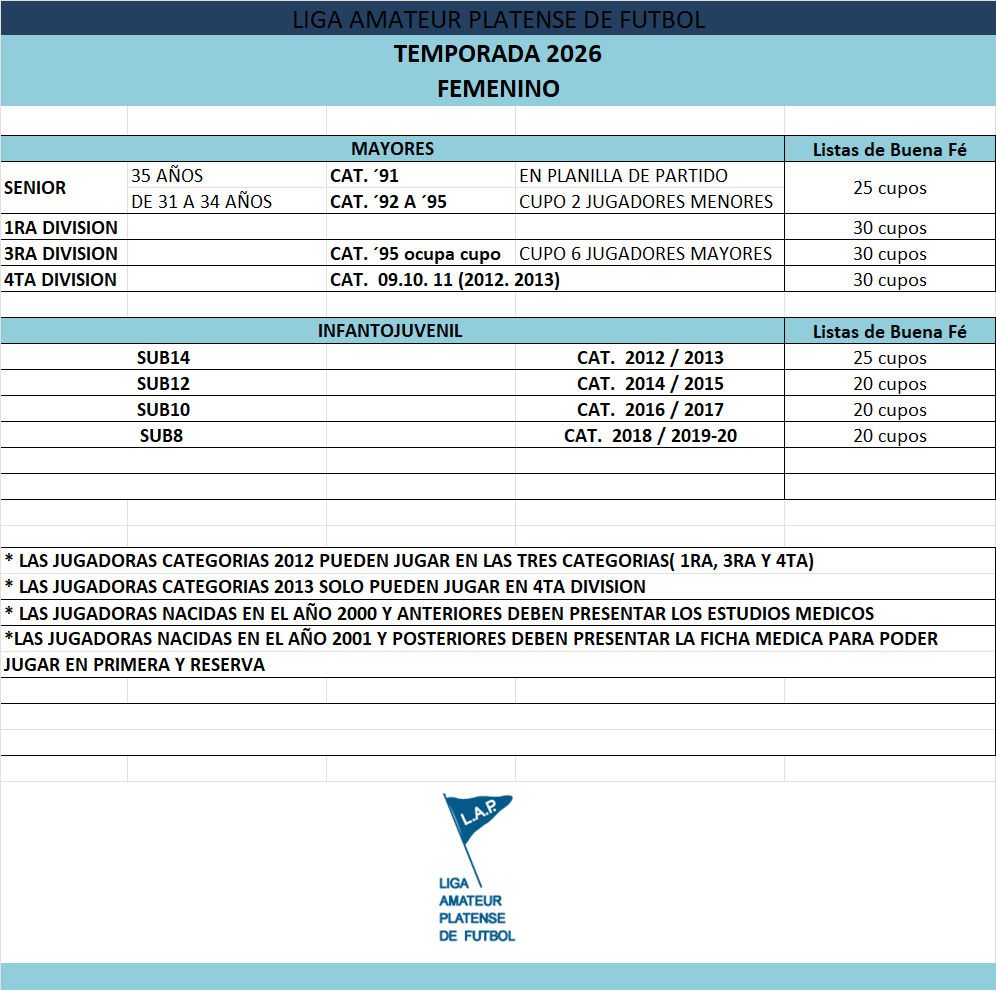 La Liga Amateur Platense de fútbol notifica: Los límites de edades para la conformación de cada de una de las categorías en la temporada 2026 de fútbol femenino y la cantidad de jugadoras que podrán ser incorporadas en cada Lista de Buena Fe.