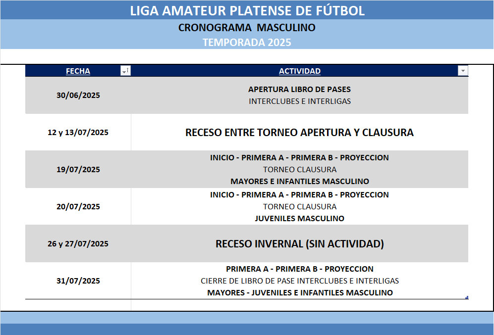Comunicamos el cronograma deportivo del fútbol masculino aprobado de forma unánime en la reunión del Comité Ejecutivo correspondiente al mes de junio.
