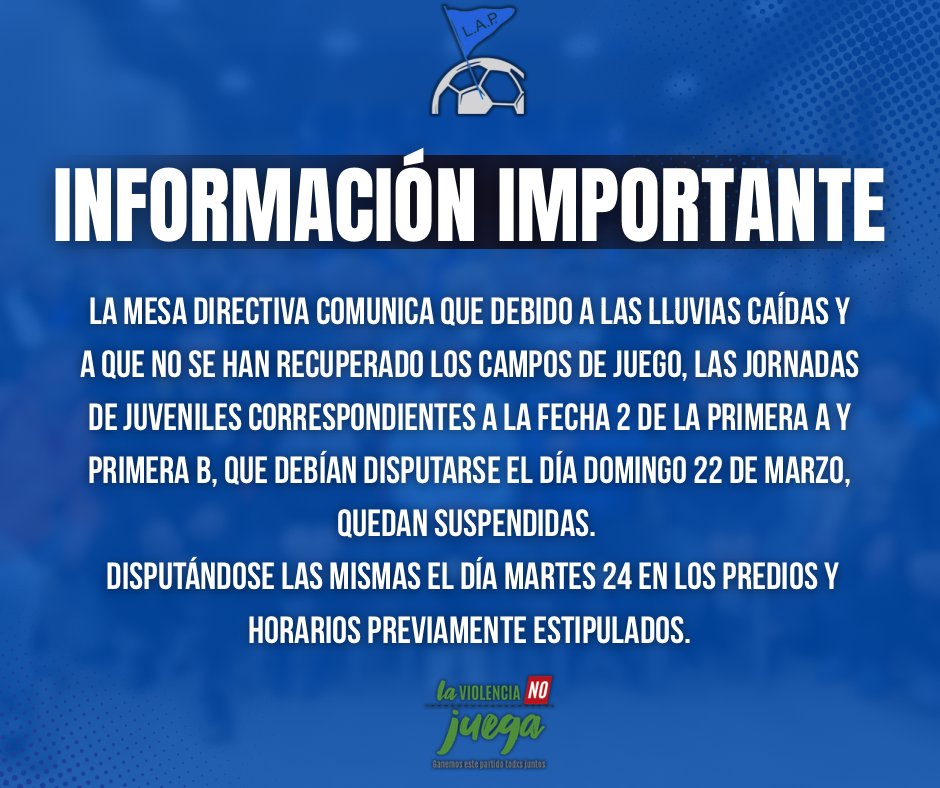 La Mesa Directiva comunica que debido a las lluvias caídas y a que no se han recuperado los campos de juego, las jornadas de JUVENILES correspondientes a la FECHA 2 de la primera A y primera B, que debían disputarse el día DOMINGO 22 de MARZO, quedan SUSPENDIDAS.