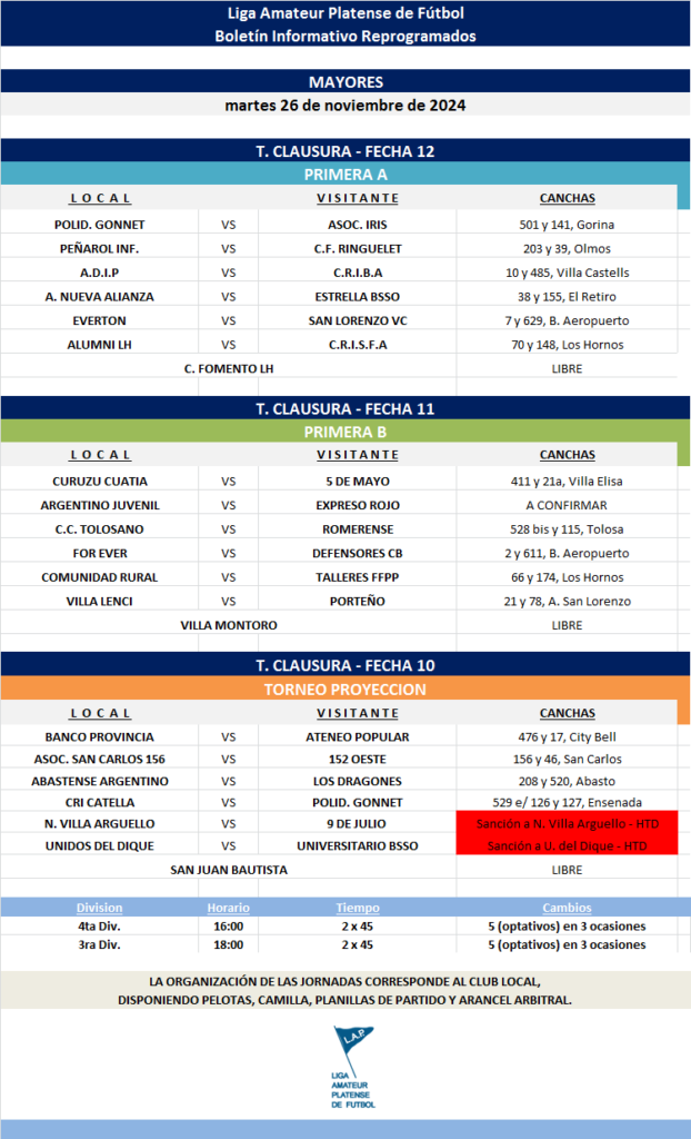 #Masculino T. CLAUSURA 2024 – Primera A – FECHA 12 | PRIMERA B – FECHA 11 | T.PROYECCIÓN – FECHA 10 4ta y 3ra división