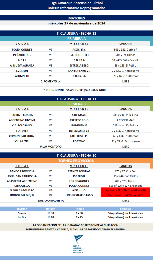 #Masculino T. CLAUSURA 2024 – Primera A – FECHA 12 | PRIMERA B – FECHA 11 | T.PROYECCIÓN – FECHA 10 Senior y Primera división