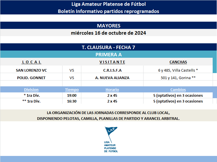 Les compartimos el boletín informativo con el anexo de las jornadas reprogramadas a disputarse los próximos martes y miércoles según el siguiente cronograma: