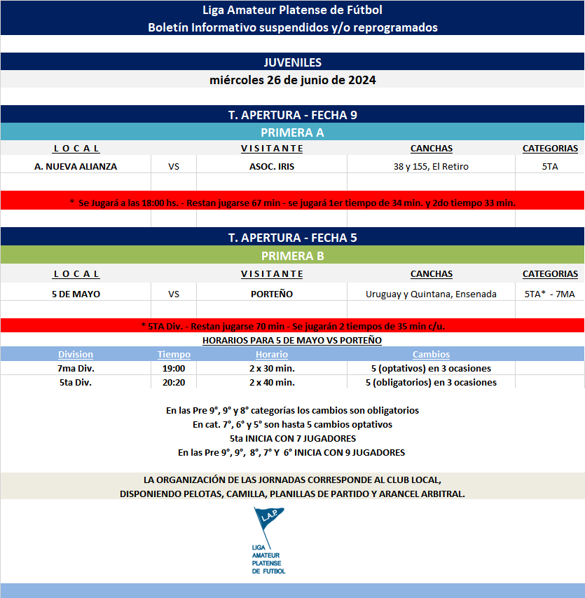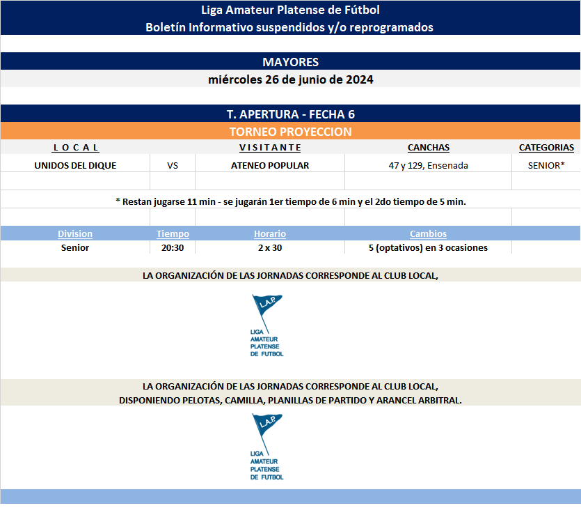 Les compartimos el boletín informativo con las jornadas suspendidas y/o reprogramadas a disputarse el próximo miércoles según el siguiente cronograma: