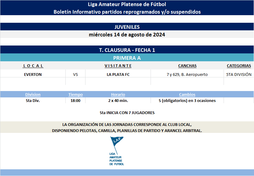 Les compartimos el boletín informativo con las jornadas suspendidas y/o reprogramadas a disputarse el próximo miércoles según el siguiente cronograma: