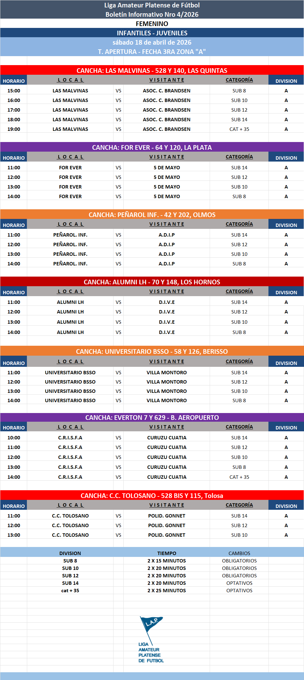 Compartimos el boletín informativo con la Programación Nro 4 a disputarse el próximo fin de semana según el siguiente cronograma: