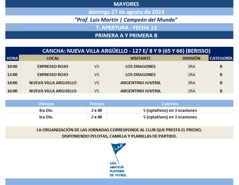 El Departamento de Fútbol Femenino notifica que, dada la imposibilidad del club EXPRESO ROJO de brindar su estadio para la disputa de los partidos previstos, la programación de partidos correspondiente a la FECHA 13 del T. Apertura de Mayores de Primera Divisional “A” y Primera Divisional “B” se disputarán en cancha del club NUEVA VILLA ARGÜELLO, 127 e/ 65 y 66 (Berisso).
