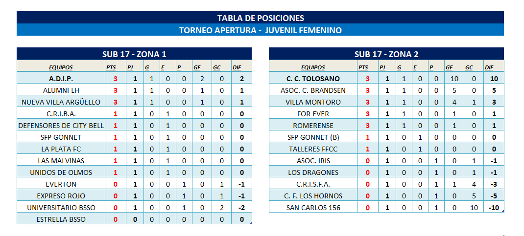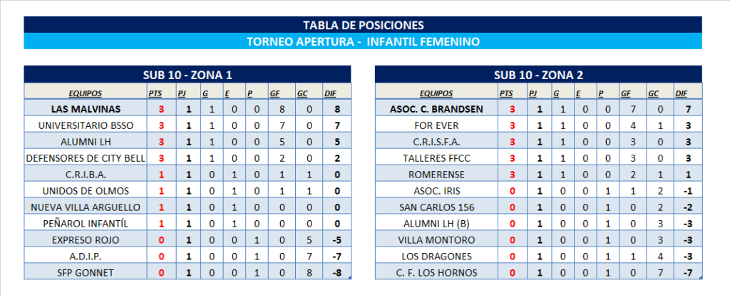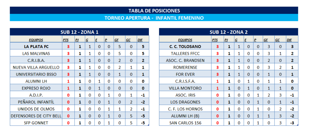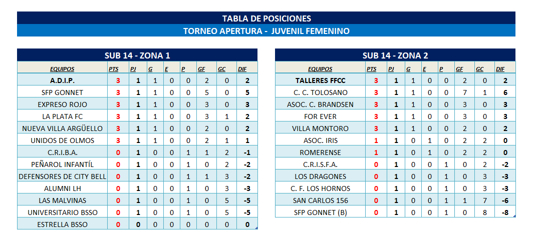 El Departamento de Fútbol Femenino comunica las tablas de posiciones del T. Apertura “Prof. Luis Martín | Campeón del Mundo” correspondiente a la FECHA 1 de las categorías Juveniles Sub 17 y Sub 14 y categorías Infantiles Sub 12 y Sub 10.