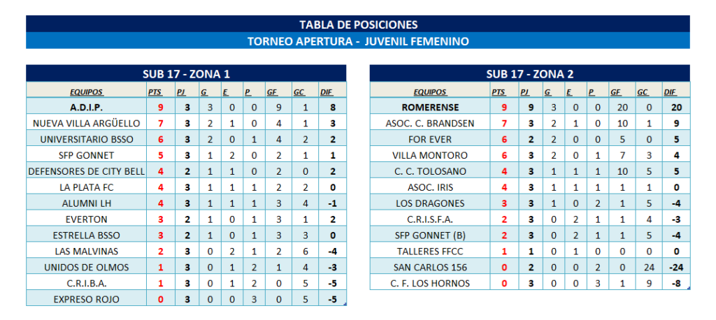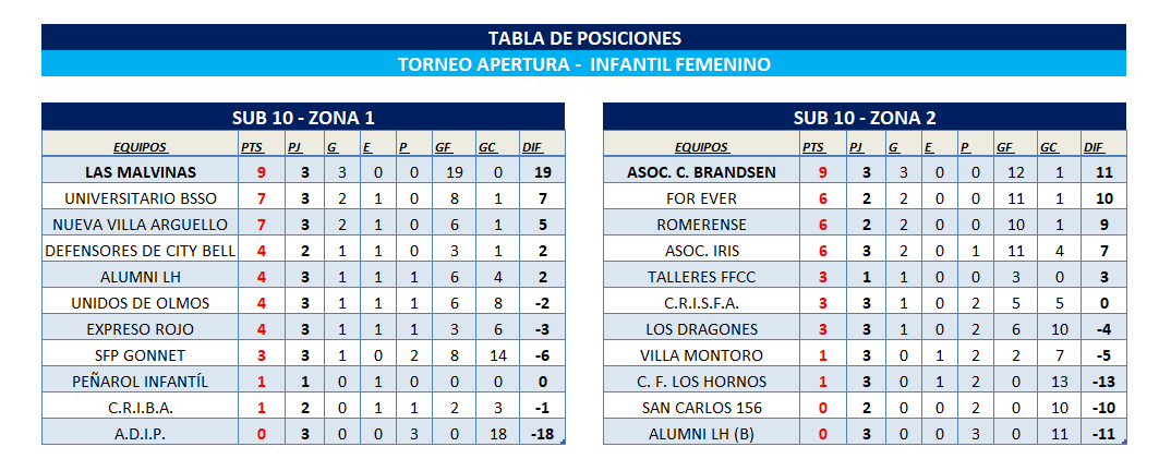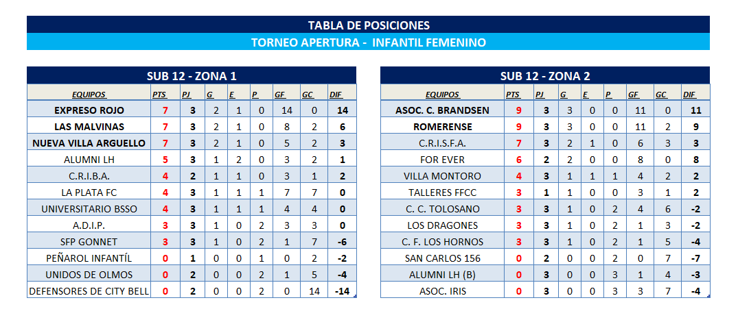 El Departamento de Fútbol Femenino comunica las tablas de posiciones del T. Apertura “Prof. Luis Martín | Campeón del Mundo” correspondiente a la FECHA 3 de las categorías Juveniles Sub 17 y Sub 14 y categorías Infantiles Sub 12 y Sub 10.