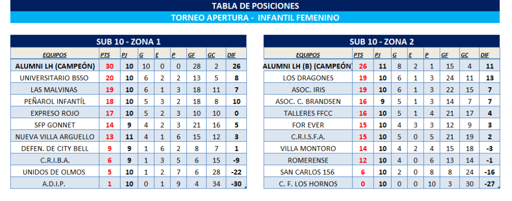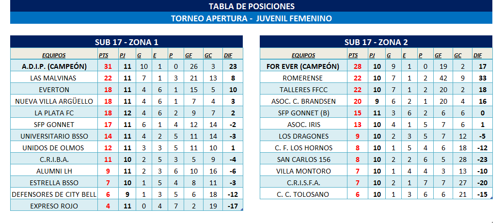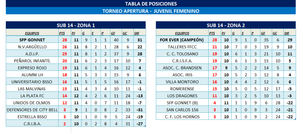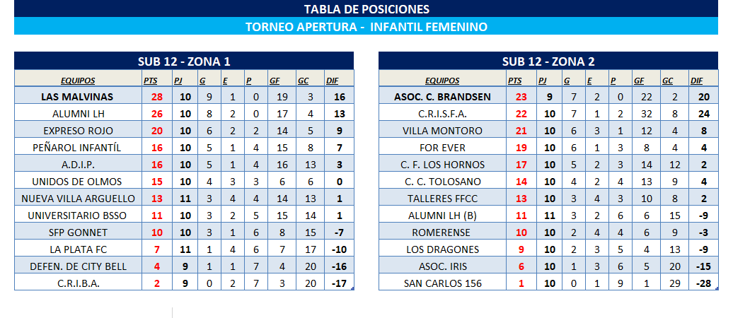 El Departamento de Fútbol Femenino comunica las tablas de posiciones del T. Clausura “Marcelo Fortes” disputada la FECHA 12 de las categorías Juveniles Sub 17 y Sub 14 y categorías Infantiles Sub 12 y Sub 10.