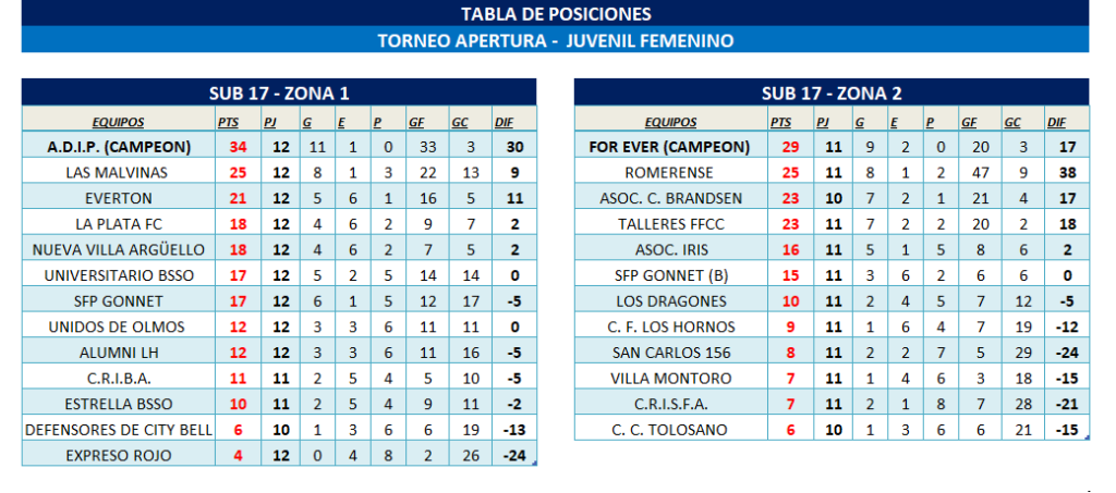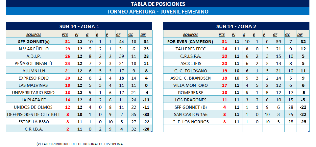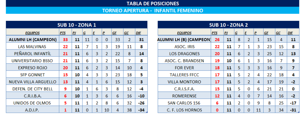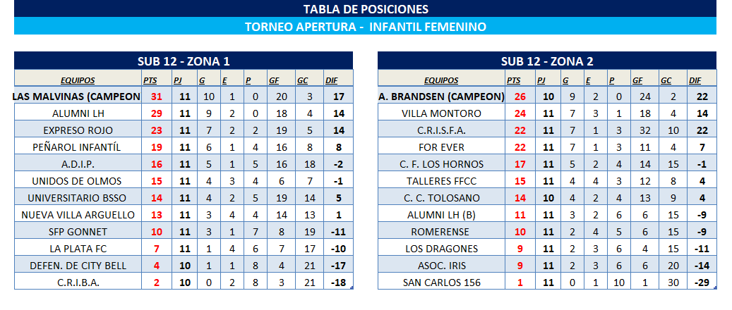 El Departamento de Fútbol Femenino comunica las tablas de posiciones del T. Clausura “Marcelo Fortes” disputada la FECHA 13 de las categorías Juveniles Sub 17 y Sub 14 y categorías Infantiles Sub 12 y Sub 10.