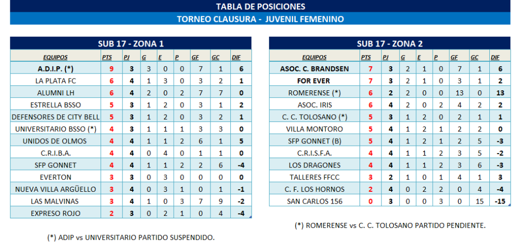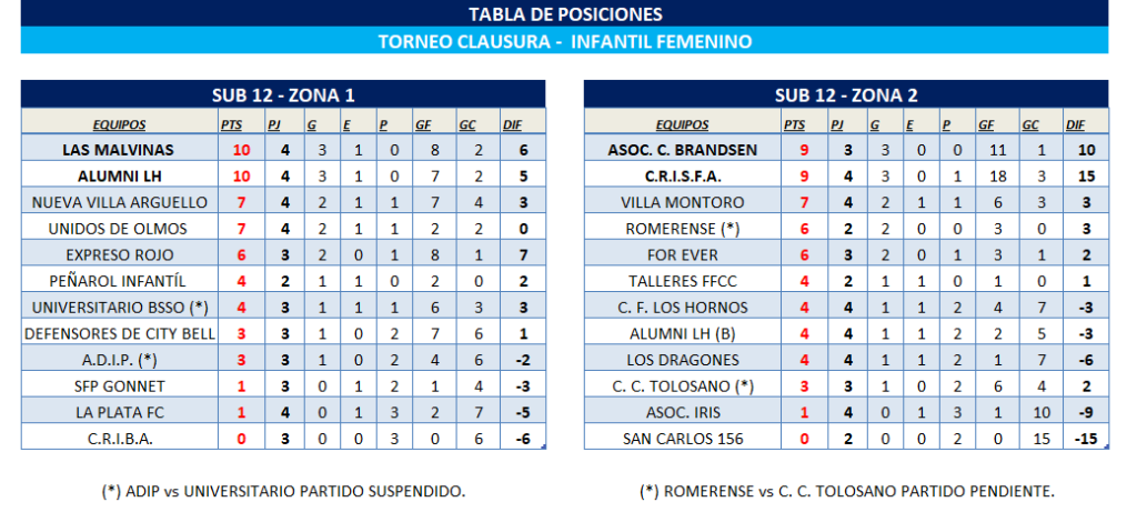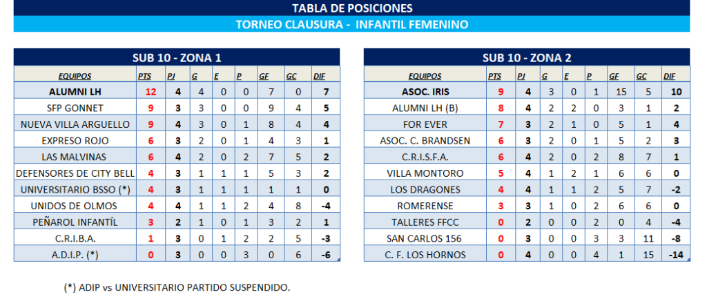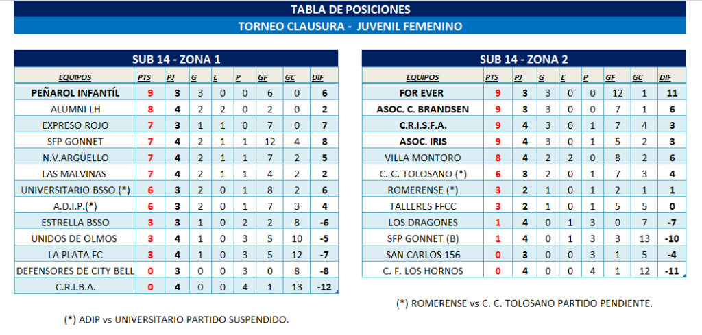El Departamento de Fútbol Femenino comunica las tablas de posiciones del T. Clausura “Marcelo Fortes” disputada la FECHA 4 de las categorías las categorías Juveniles Sub 17 y Sub 14 y categorías Infantiles Sub 12 y Sub 10.