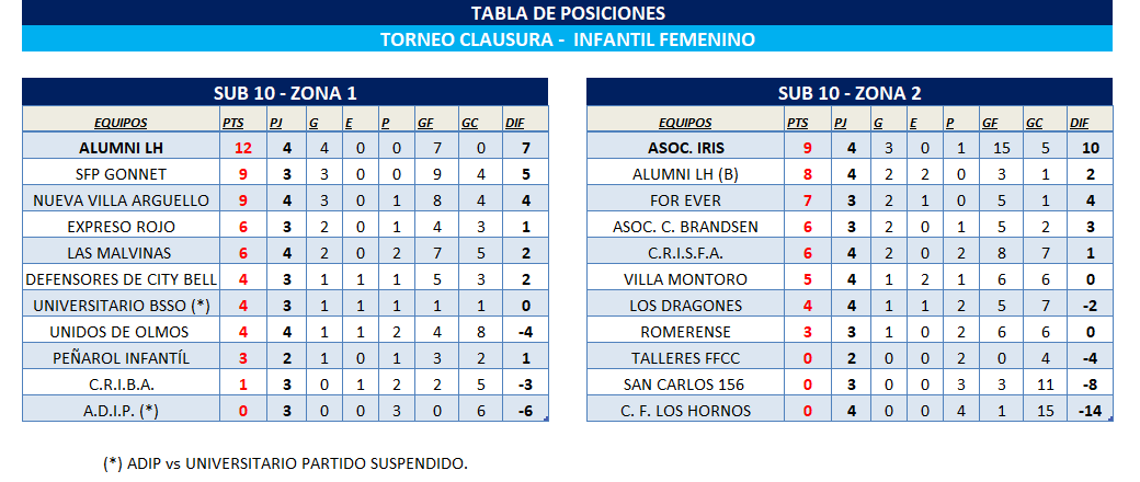 POSICIONES INFANTO-JUVENIL FEMENINO – T. CLAUSURA FECHA 4