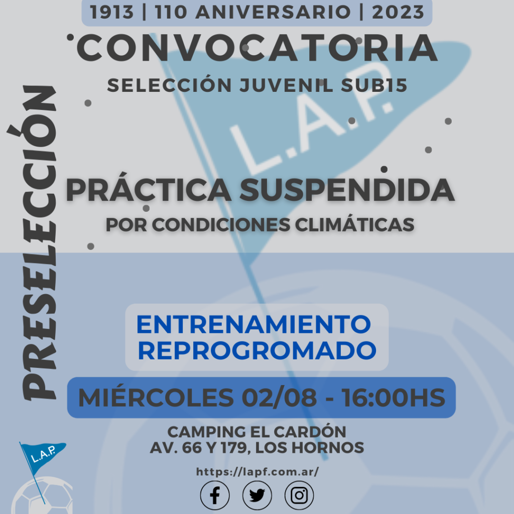 DEBIDO A LAS CONDICIONES CLIMÁTICAS Y EL ESTADO DEL CAMPO DE JUEGO DE LA CANCHA DEL CAMPING EL CARDÓN, LA PRÁCTICA DE LA PRESELECCIÓN JUVENIL SUB15 HA SIDO SUSPENDIDA DE LA JORNADA DEL MIÉRCOLES 12/07. LOS ENCUENTROS SE RETOMARÁN LUEGO DEL RECESO ESCOLAR -VACACIONES DE INVIERNO-, EL MIÉRCOLES 02/08 A LAS 16:00HS EN EL CAMPING EL CARDÓN, AV. 66 Y 179 (LOS HORNOS).