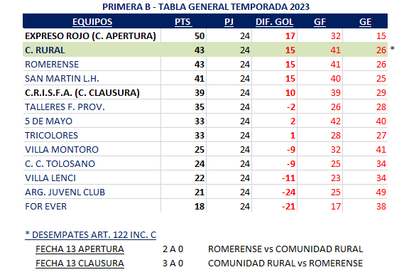 HABIÉNDOSE RECOPILADO LA INFORMACIÓN OFICIAL A TRAVÉS DE LAS PLANILLAS DE PARTIDO CORRESPONDIENTES, LOS CLUBES COMUNIDAD RURAL Y ROMERENSE IGUALARON SU POSICIÓN EN LA TABLA GENERAL DE LA TEMPORADA 2023, EMPANDO EN PUNTOS, DIFERENCIA DE GOL Y GOLES A FAVOR. SEGÚN EL CRITERIO DE DEFINICIONES Y DESEMPATES DEL ART. 122 DEL REGLAMENTO GENERAL, POR PARTIDOS ENTRE SI EL CLASIFICADO AL REPECHAJE POR LA PROMOCIÓN ES COMUNIDAD RURAL.