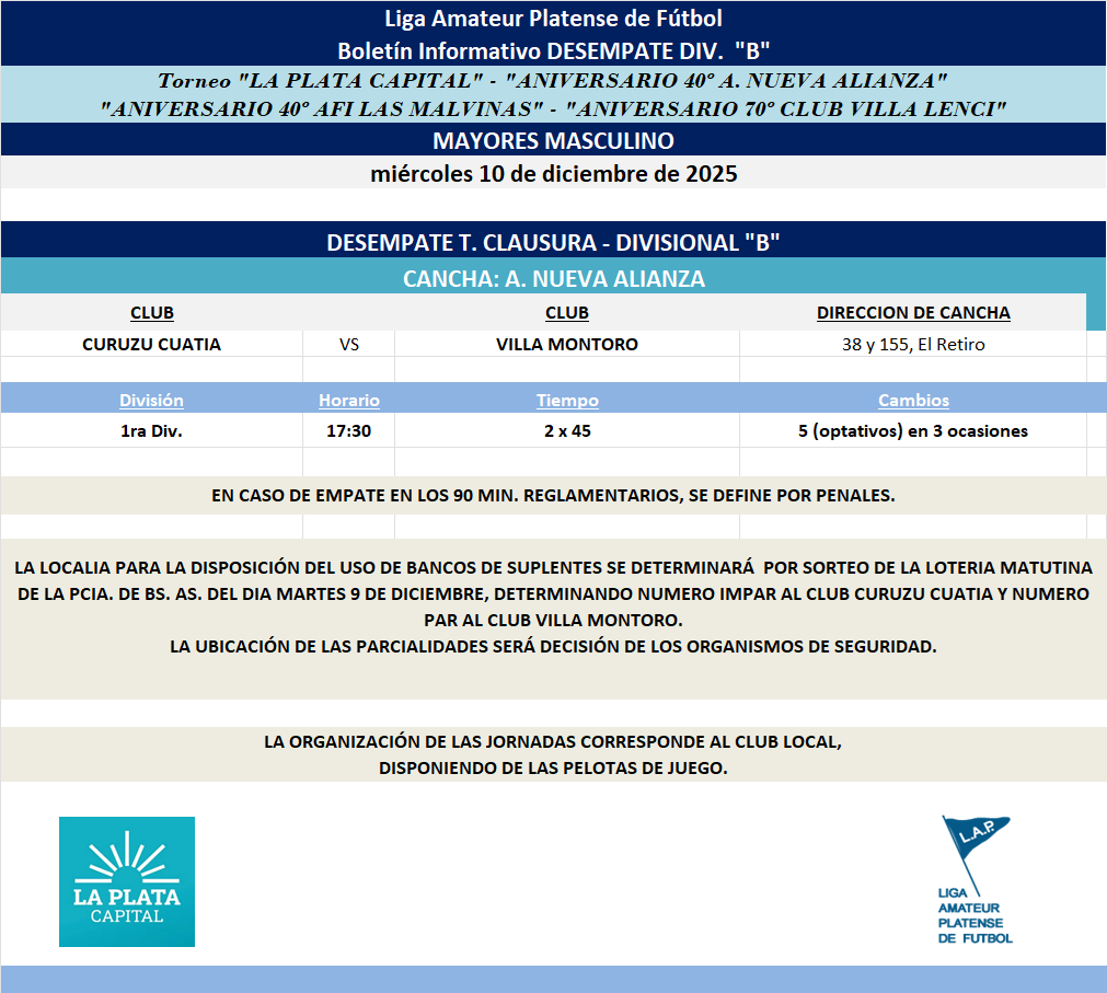 PROGRAMACIÓN DESEMPATE DIVISIONAL “B” – 2025: T. CLAUSURA LA PLATA CAPITAL – ANIVERSARIO 40 NUEVA ALIANZA – ANIVERSARIO 70 VILLA LENCI – ANIVERSARIO 40 LAS MALVINAS