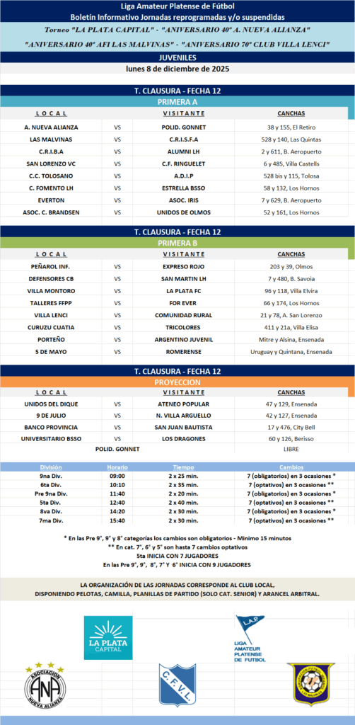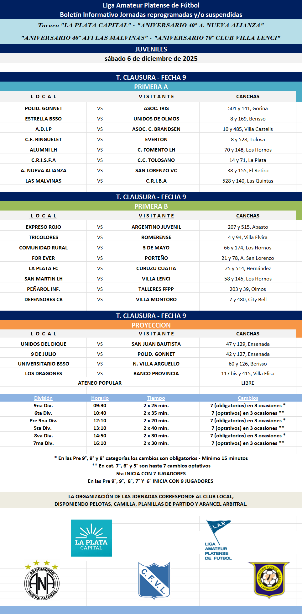 PROGRAMACIÓN JORNADAS REPROGRAMADAS Y/O SUSPENDIDAS – 2025: T. CLAUSURA LA PLATA CAPITAL – ANIVERSARIO 40 NUEVA ALIANZA – ANIVERSARIO 70 VILLA LENCI – ANIVERSARIO 40 LAS MALVINAS