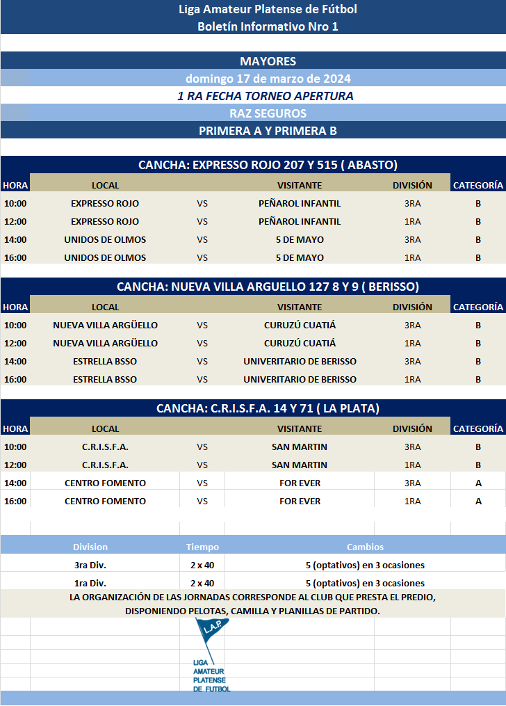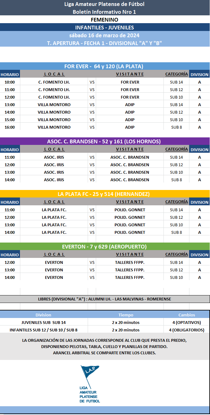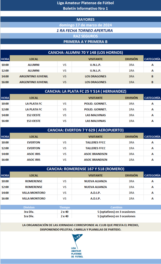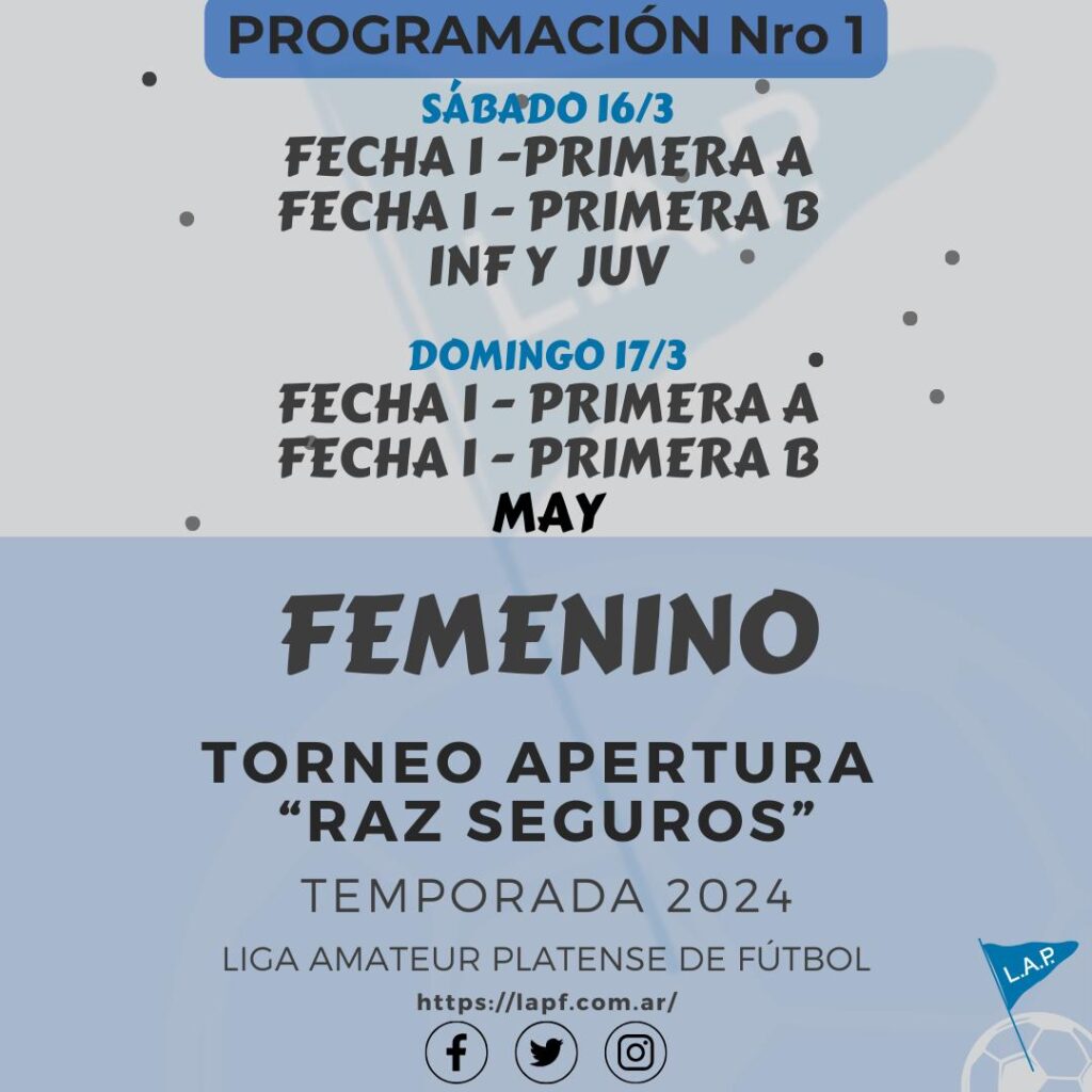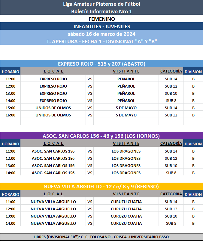 Les comunicamos el boletín informativo con la programación N°1 a disputarse el próximo fin de semana según el siguiente cronograma: