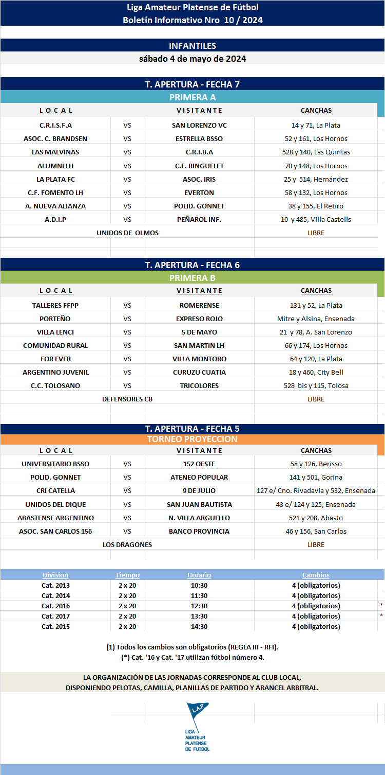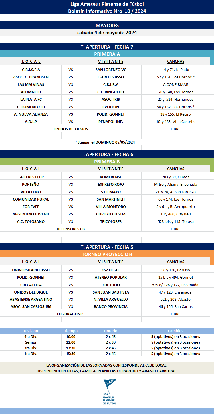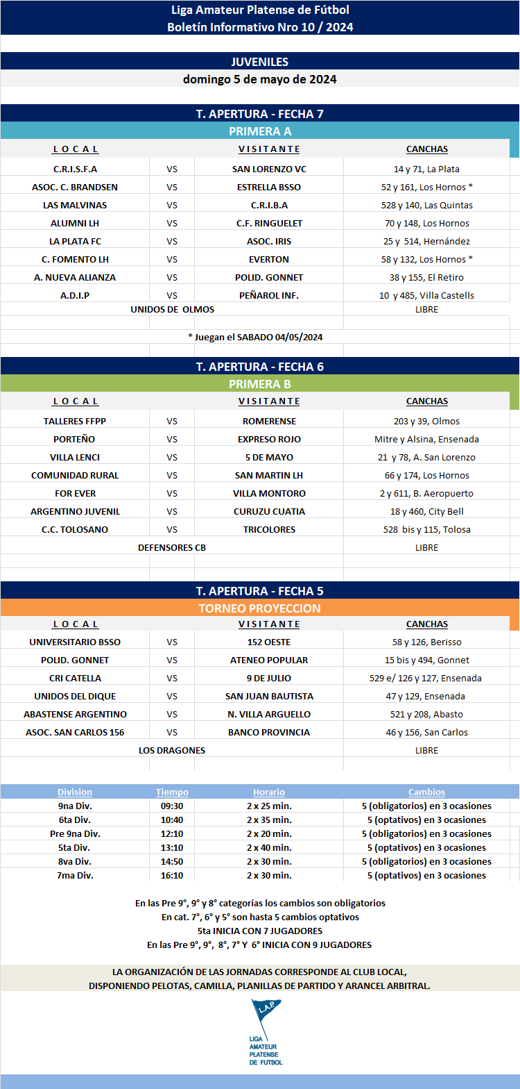 Les compartimos el boletín informativo con la programación Nro°10 a disputarse el próximo fin de semana según el siguiente cronograma: