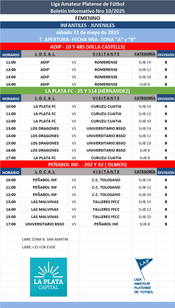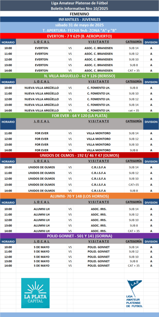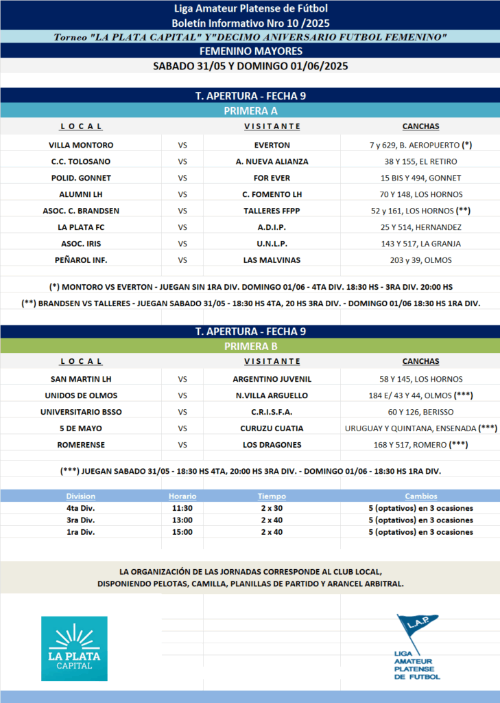 Les comunicamos el boletín informativo con la programación N°10 a disputarse el próximo fin de semana según el siguiente cronograma: