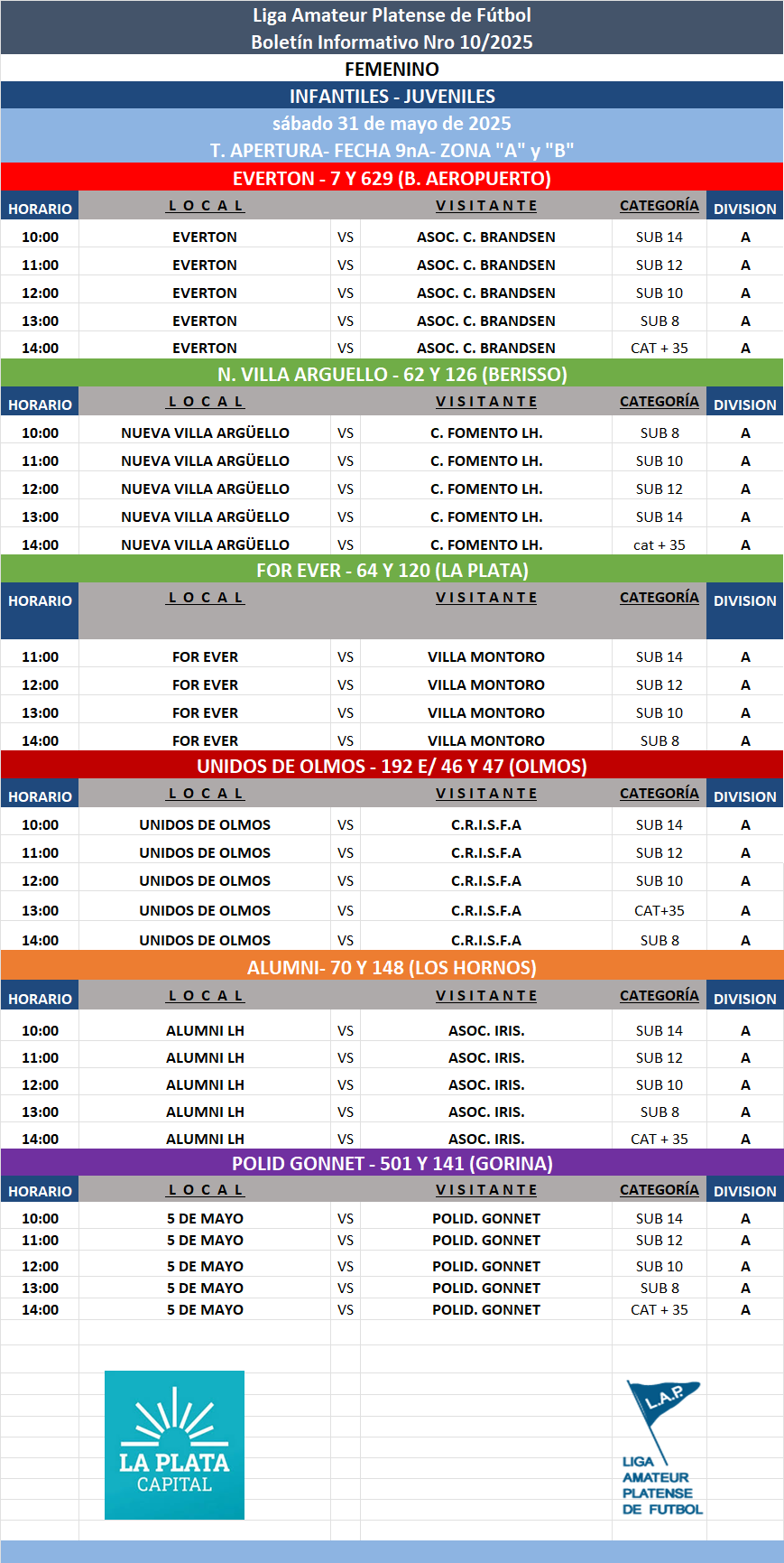 Les comunicamos el boletín informativo con la programación N°10 a disputarse el próximo fin de semana según el siguiente cronograma:
