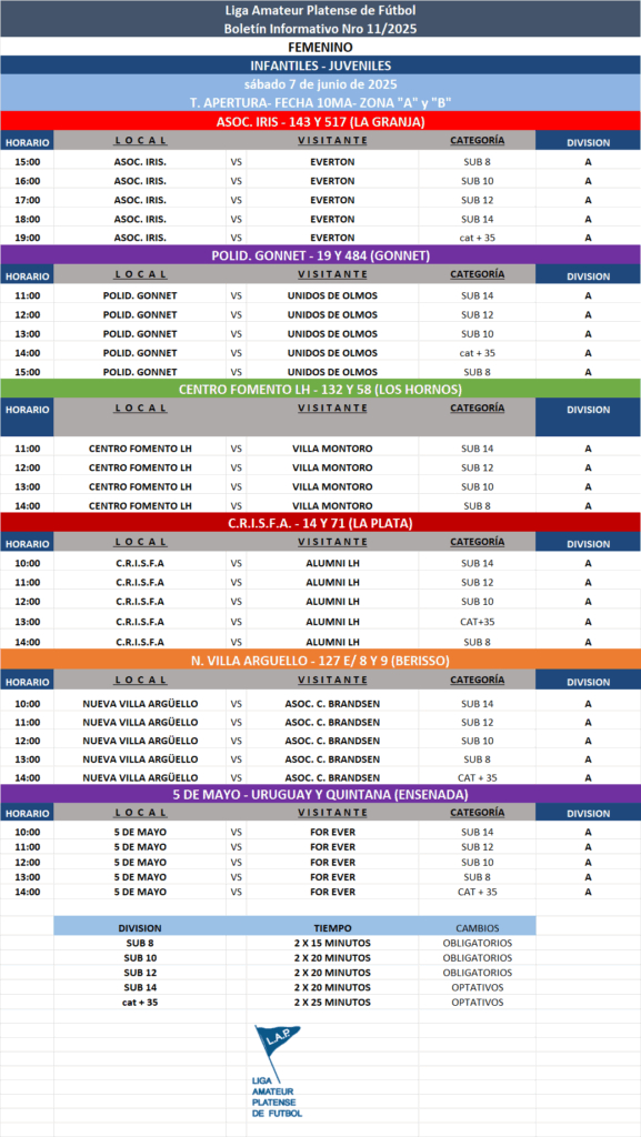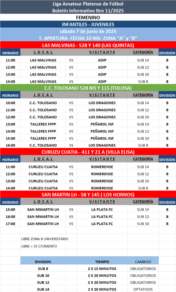 Les comunicamos el boletín informativo con la programación N°11 a disputarse el próximo fin de semana según el siguiente cronograma: