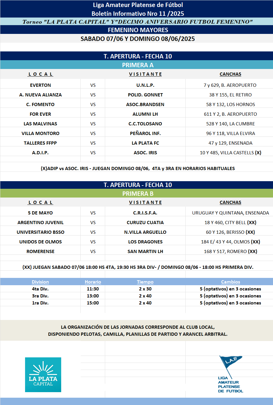 Les comunicamos el boletín informativo con la programación N°11 a disputarse el próximo fin de semana según el siguiente cronograma: