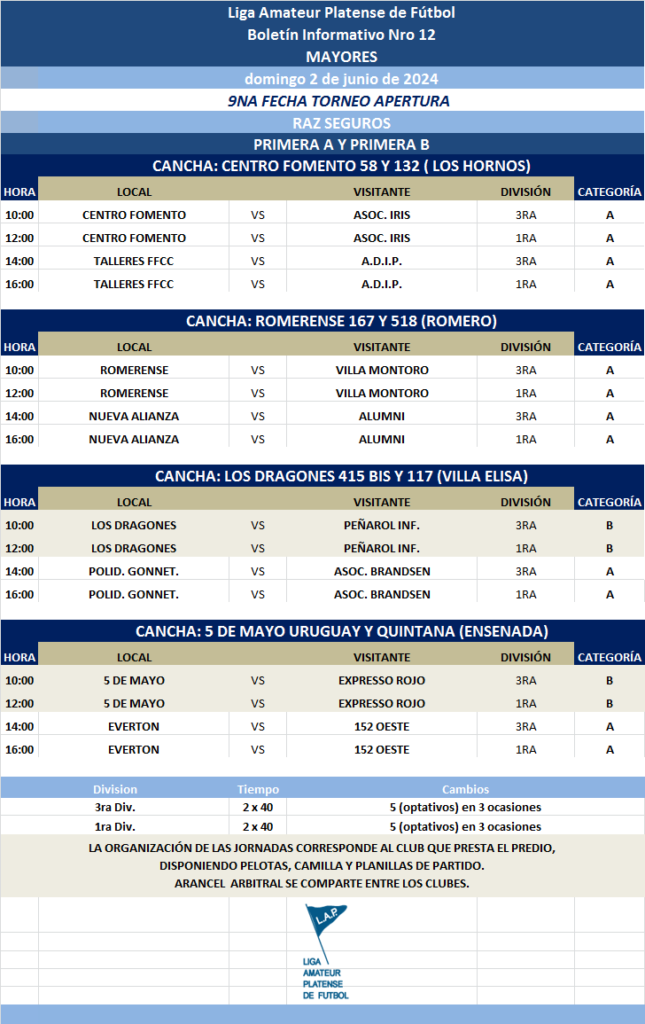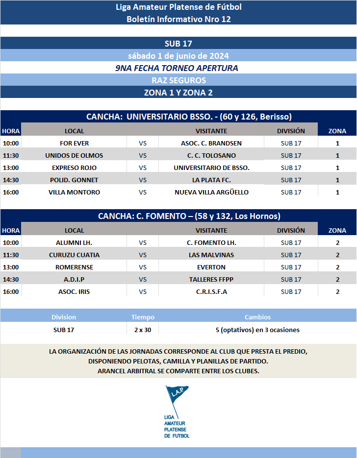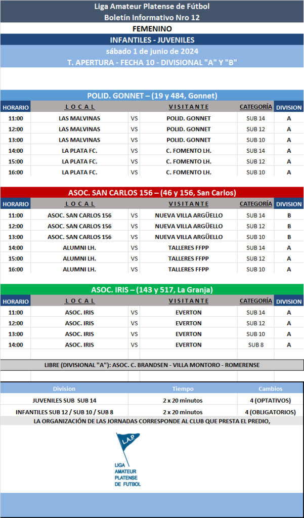 Les comunicamos el boletín informativo con la programación N°12 a disputarse el próximo fin de semana según el siguiente cronograma: