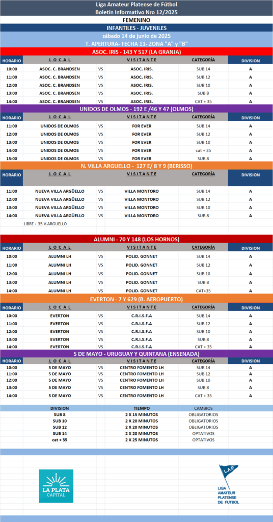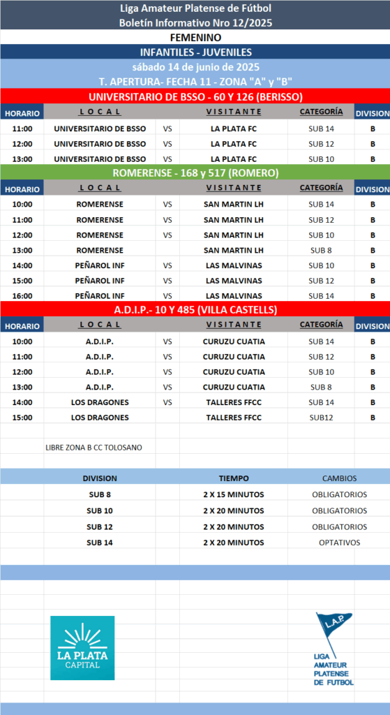Les comunicamos el boletín informativo con la programación N°12 a disputarse el próximo fin de semana según el siguiente cronograma: